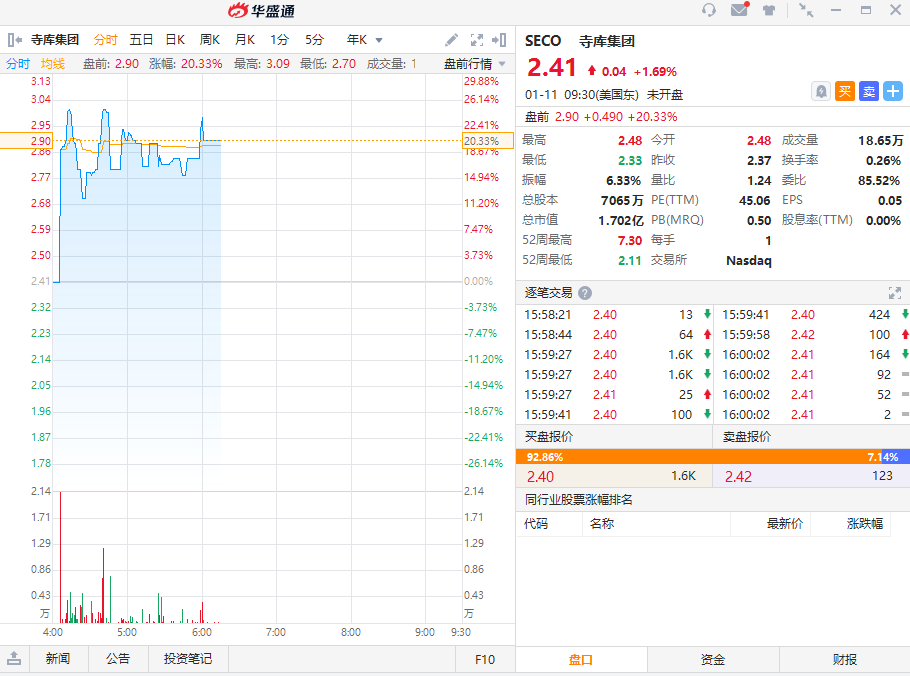 美股盘前,寺库(SECO.US)股价上涨,该股涨20.33%,报2.9美元。