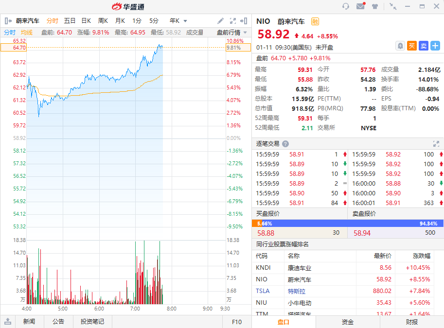 蔚来(NIO)盘前涨10%,股价最高至64.95美元。按照前一日收盘价58.92美元计算,总市值为918.51亿美元,加上今日10%的涨幅,蔚来总市值达到1000亿美元的一刻就在眼前。