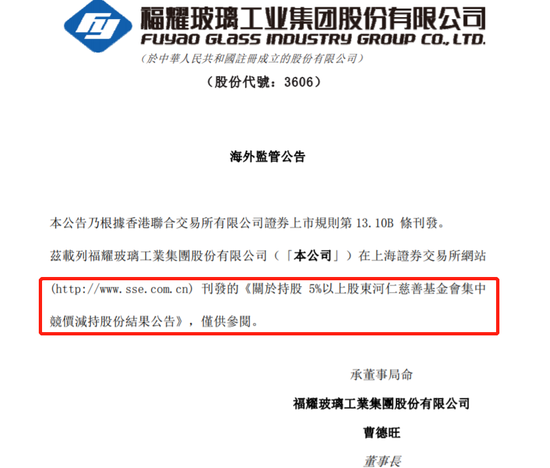 福耀玻璃:河仁基金会减持600万股 套现3.37亿元