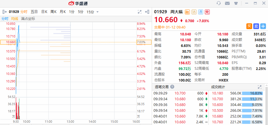 华盛资讯1月12日讯,周大福早盘异动,短线拉升逾8%。截至发稿,周大福涨7.03%,现报10.66港元每股,当前成交额3489万港元,总市值为1066亿港元。