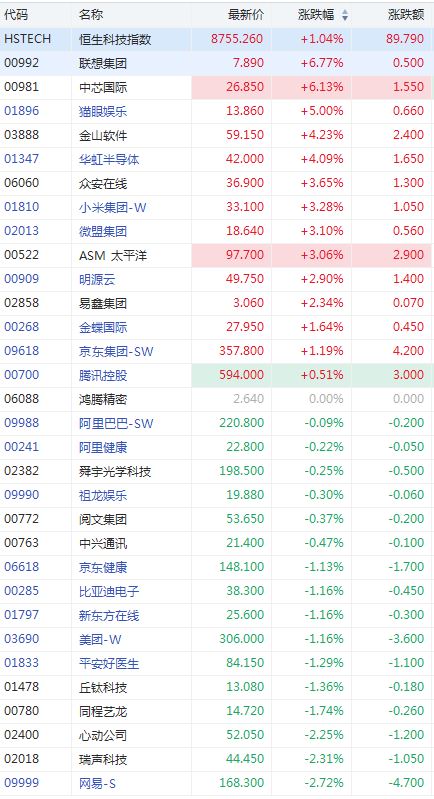 芯片股走强,中芯国际涨6%,华虹半导体涨超5%,ASM太平洋涨超3%;猫眼娱乐涨5%,创去年十月以来新高,小米集团均涨超3%。