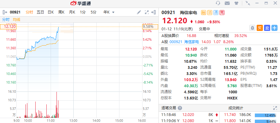 华盛资讯1月12日消息,海信家电H股盘中短线拉升逾9%,破五日以来新高,A股亦涨超8%。截止发稿,海信家电上涨9.58%,现报12.12港元每股。当前成交额1765万港元,总市值为165.1亿港元。
