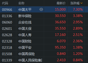 1月12日消息,内险股集体走高,中国太平涨超7%,新华保险涨超3%,中国太保涨2.89%,中国人寿㽴2.51%,中国平安涨1.38%。