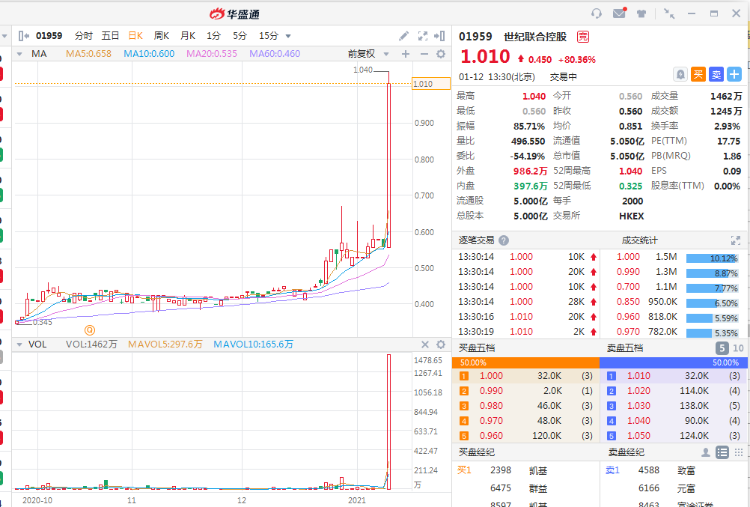 1月12日消息,世纪联合控股成特斯拉二手车置换服务特约合作商,午后涨幅越来越大。截至发稿,世纪联合涨80%,市值5亿港元。