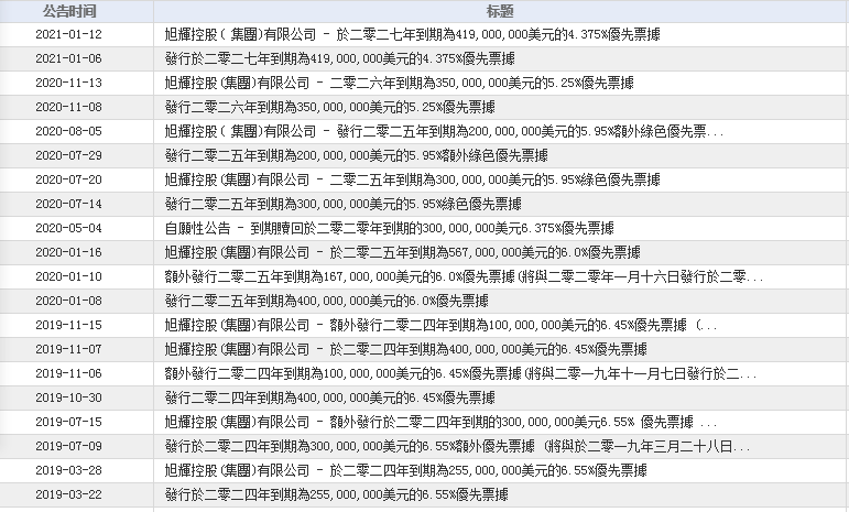 1月12日,旭辉集团公告公司境外发行2027年到期的4.19亿美元优先票据,年利率4.375%,意在对现有债务再融资,也就是“借新还旧”。