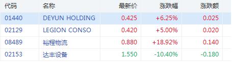 LEGION CONSO(02129.HK)等四只新股今日正式上市。目前LEGION CONSO(02129.HK)涨5%;DEYUN HOLDING(01440.HK)涨6.25%;裕程物流(08489.HK)大涨18%;达丰设备(02153.HK)跌10%。