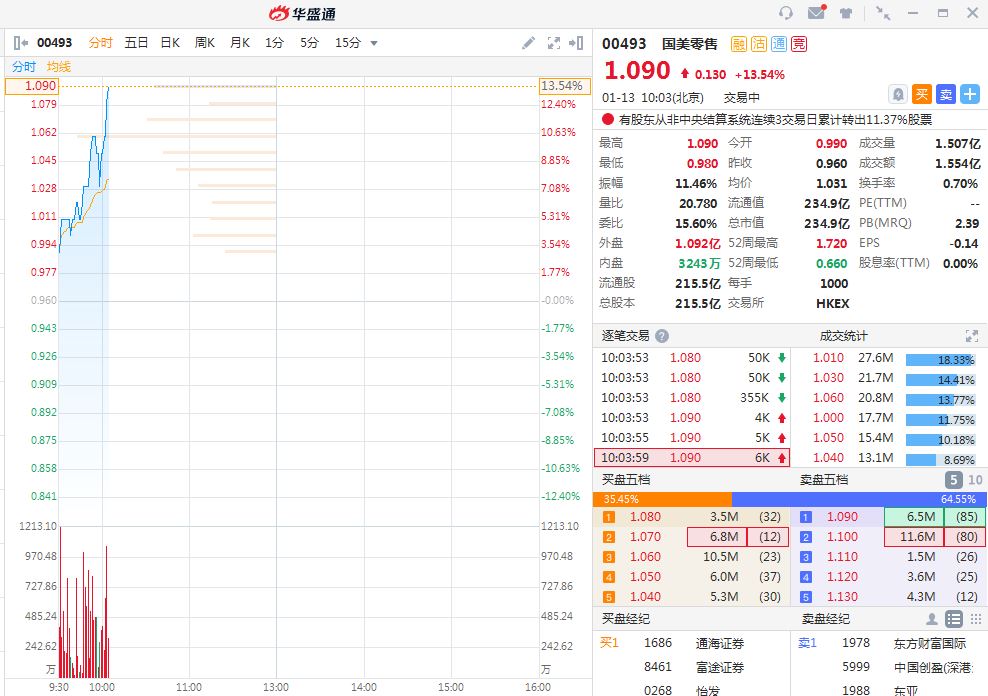 华盛资讯1月13日消息,国美零售高开高走,截至发稿,报1.09港元,成交额1.554亿港元,目前市值234亿港元。