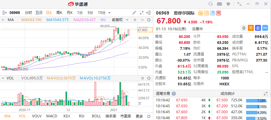 华盛资讯1月13日讯,思摩尔国际(06969)今日强势走高,盘中涨超7%逼近历史新高。截至发稿,思摩尔涨7.19%,现报67.8港元,成交量达996.6万股,成交额6.617亿港元,当前总市值为3976亿港元。