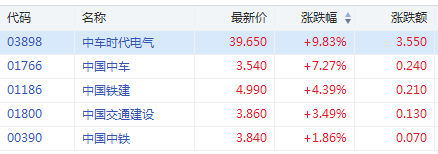 高铁基建股拉升 中车时代电气涨超9%中国中车涨超7%