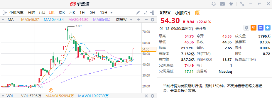 小鹏在当天交易时间,股价持续保持强势上涨,收市价报54.3美元,收市涨幅达22.4%,总市值达387.2亿美元。