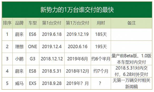 小鹏 G3为小鹏汽车第一款量产车,与蔚来 ES6、 理想 ONE同属电动SUV,造车新势力三家量产一万台车并交付的时间均为6个月左右,反映出三者造车能力相当。