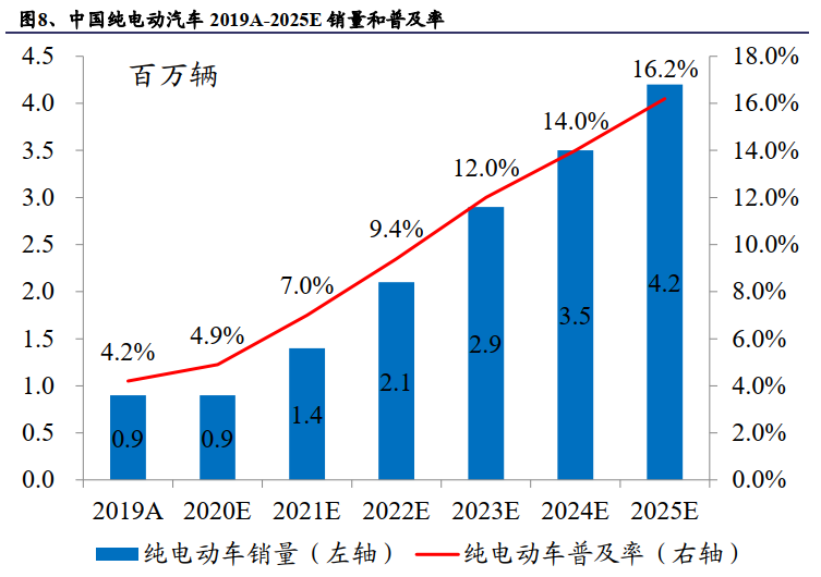 根据 Markit报告,从2019年到2025年,中国的电动汽车销量预计将以29.4%的复合年增长率增长,到2025年将达到420万辆。