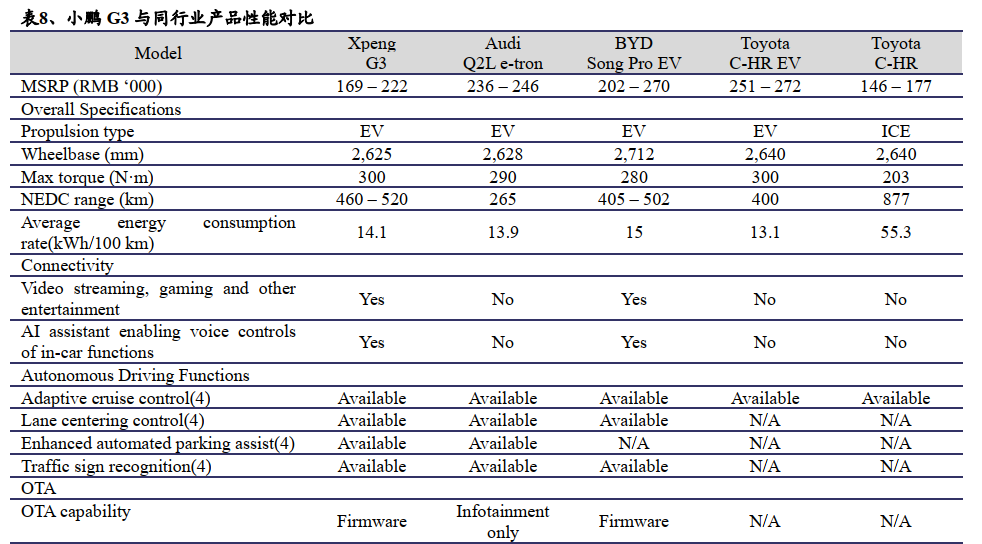 机构IHS Markit将小鹏的G3与它在EV(电动车)和ICE(内燃机汽车)市场上的竞争机型进行了比较。 G3提供了各种连接性和自动驾驶功能,这些功能要在高价位的车辆上才能做到常见。这些功能为它所属于的中高端市场提供了具有竞争力的行驶里程和EV性能特征。
