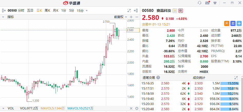 从股价表现上看,1月至今,赛晶科技股价上涨超20%。