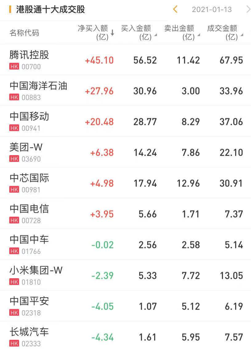个股方面,今日南下资金净买入腾讯控股45.10亿港元,为今日买入之最。此外,南下资金净买入中国海洋石油27.96亿港元,净买入中国移动20.48亿港元。