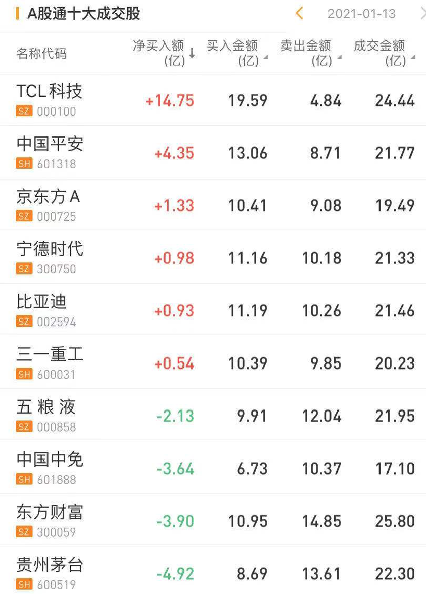 北上资金今日净买入TCL科技14.75亿元,为今日买入之最。此外,北上资金今日净买入中国平安4.35亿元。