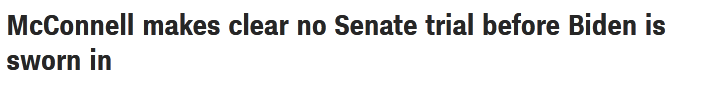 【环球网快讯】据CNN刚刚消息,参议院多数党领袖麦康奈尔13日明确表示,在拜登宣誓就职前,参议院不会对特朗普弹劾案进行审判。