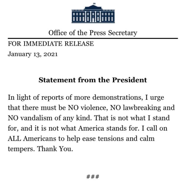 特朗普在声明中表示,“鉴于有关更多示威活动的报道,我敦促一定不能出现暴力、违法和任何形式的破坏行为。”“(暴力)不是我所主张的,也不是美国所主张的。我呼吁所有美国人帮助缓解紧张局势,平息情绪(怒火),谢谢。”