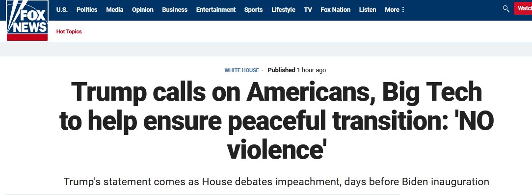 “特朗普总统要求所有美国人同他一起,确保下周有个有序、平稳的过渡,”特朗普一名高级顾问称,“总统还要求大型科技公司与他一起努力。”“这是我们国家历史上的关键时刻,我们当然可以齐心协力传递这一重要信息,而不是继续玩党派政治”。