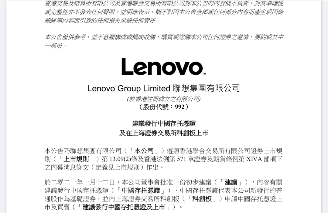 1月12日晚9时左右,联想集团在港交所公告:拟发行中国存托凭证及在上海证券交易所科创板上市。
