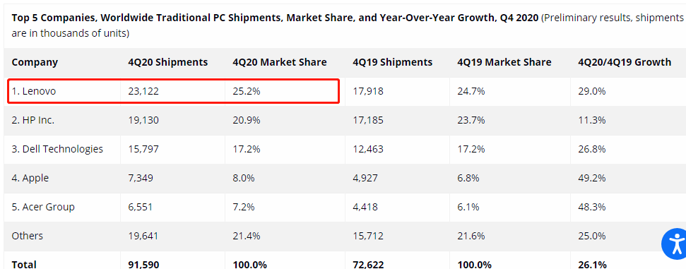 国际市场研究机构IDC发布的全球个人电脑市场最新数据显示,2020年,全球个人电脑市场出货量同比增长13.1%,前三大厂商中,联想集团出货量同比增速高达29%,排名保持全球第一。