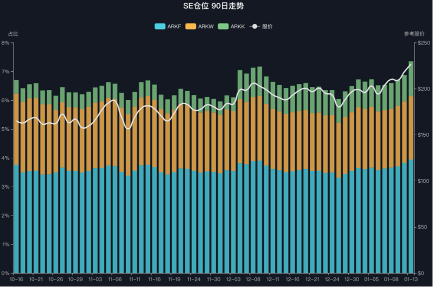 近60日,ARK旗下基金在东南亚互联网公司Sea Limited上的头寸,如下图所示: