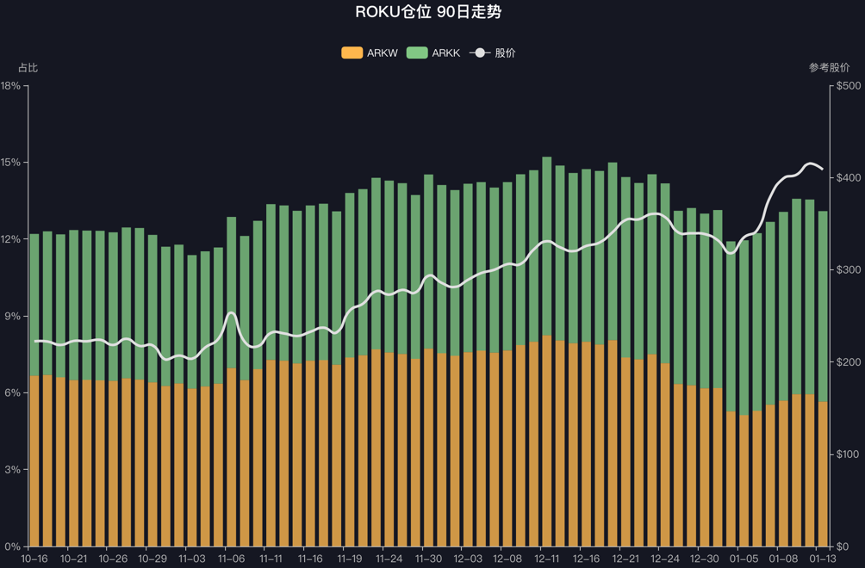 随着股价上涨,ARK旗下基金在流媒体新秀Roku上的仓位略有减少,显示较强的减仓意愿: