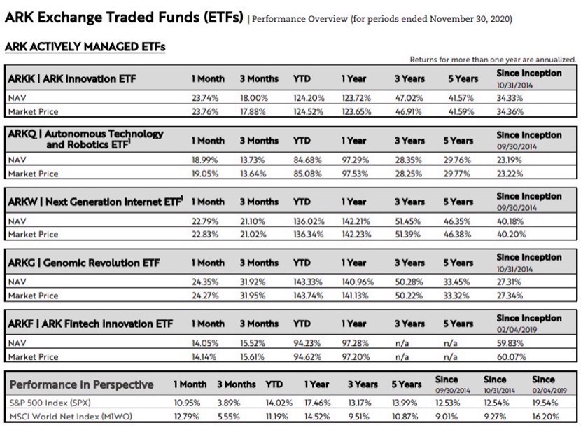 ARK投资公司旗下5只主动管理型ETF,截至11月底,表现最差的一只也有近30%的5年年化回报,表现最好的5年年化回报高达46.35%,该成绩是巴菲特平均水平的两倍! 由于其惊人的业绩,和对科技公司独特的见解,ARK基金的一举一动也成为市场焦点,以其为范本的“抄作业投资法”日渐盛行。