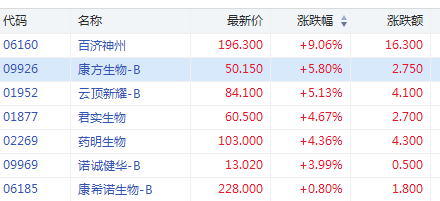 生物技术股走强 百济神州涨超9%康方生物涨超5%