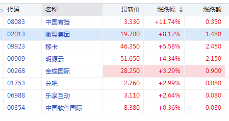 1月14日消息,SaaS概念股上涨,中国有赞涨超11%,微盟集团涨超8%,移卡涨超5%,明源云涨4%,金蝶国际涨超3%,兑吧涨超2%。