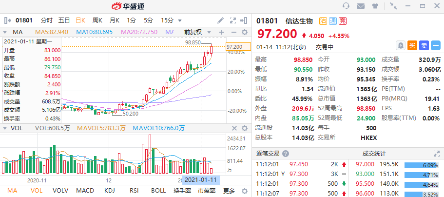 华盛证券1月14日消息,信达生物(01801)盘中快速拉升,股价创新高,最高见98.85港元。截至发稿,信达生物涨4.35%,现报97.2港元每股,当前成交额达3.06亿港元,总市值为1363亿港元,已连续三个交易日收红。