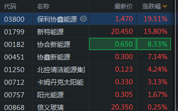 1月14日消息,光伏太阳能股上涨,保利协鑫能源涨近20%,新特能源涨近16%,协合新能源涨超8%,协鑫新能源涨超7%,北控清洁能源涨超4%。