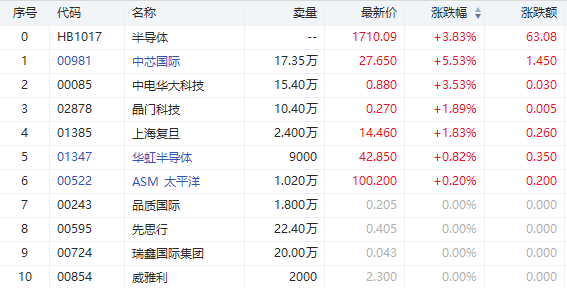 华盛资讯1月14日消息,半导体股今日涨幅居前。截至发稿,中芯国际涨超5%,中电华大科技涨超3%,晶门科技、上海复旦涨超1%,ASM太平洋、华虹半导体微涨。