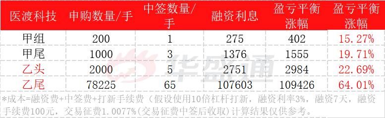乙头融资打新2000手,以中签5手为例,盈亏平衡点22.69%;