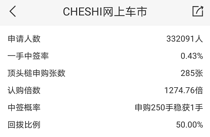 总认购人数332091人,245015人只认购1手(一手党),中签率0.43%,申请250手稳获1手。