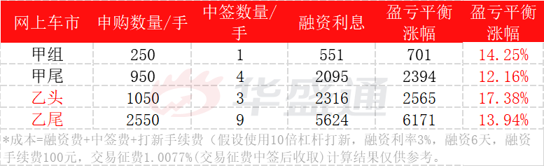 甲组融资打新250手,利息551港元,盈亏平衡点14.25%;