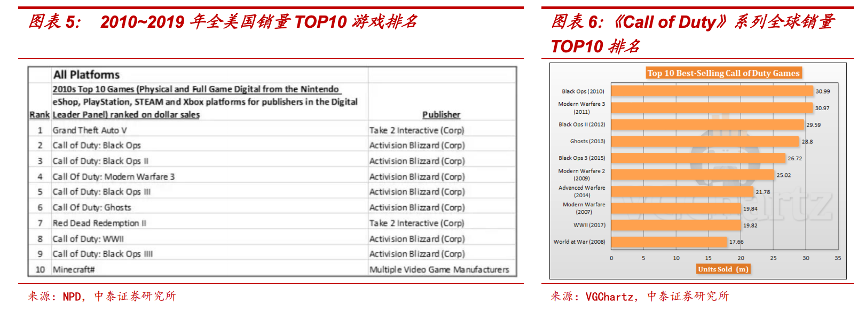 海外的巨头则包括动视暴雪、EA、Take Two在内,其中以动视暴雪国内受众偏多。动视暴雪最为出名的FPS游戏《Call of Duty》不仅在中国玩家中拥有非常高的口碑,在海外也常年霸榜。根据统计,2010-2019年全美游戏销量TOP10中,《Call of Duty》占据7席,广受玩家追捧。