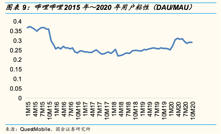 哔哩哔哩用户粘性在2020年疫情后有显著提升。