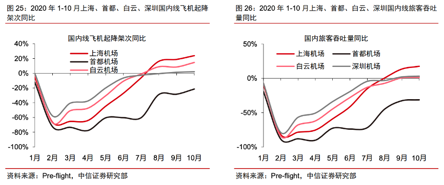 自2月新冠疫情发生后,国内线飞机起降架次及旅客吞吐同比快速下降。疫情控制后, 国内线飞机起降架次及旅客吞吐同比也出现快速回升。