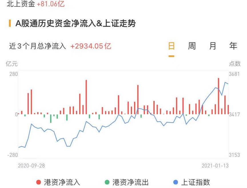 北上资金今日净流入81.06亿元,流入规模增加超20亿元。