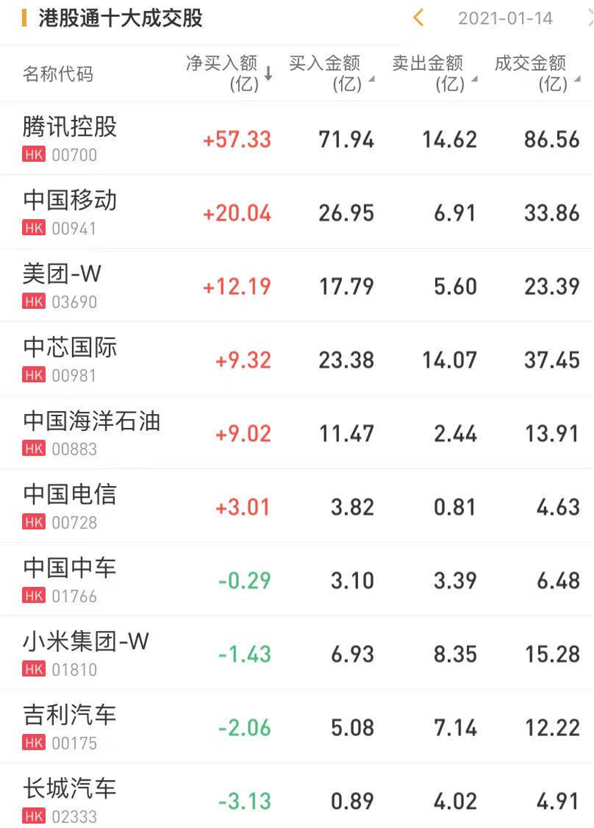 个股方面,今日南下资金净买入腾讯控股57.33亿港元,为今日买入之最。此外,南下资金净买入中国移动20.04亿港元,净买入美团-W12.19亿港元。