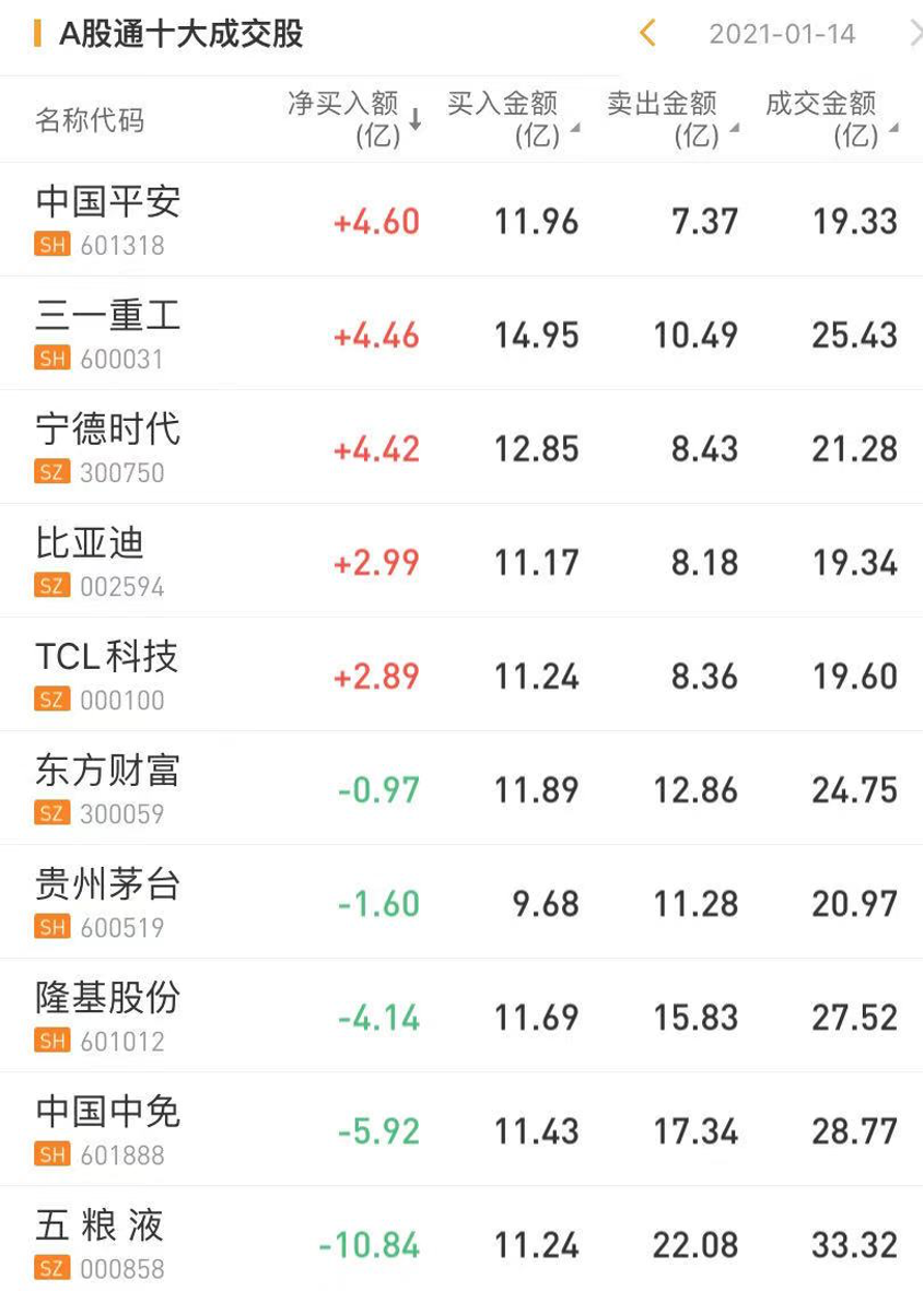 北上资金今日净买入中国平安4.60亿元,为今日买入之最。此外,北上资金今日净买入三一重工4.46亿元。