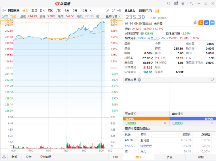 1月14日(周四)美股盘前,阿里巴巴(BABA.US)股价上涨,截止至22:11,涨3.78%,报价244.19美元。今日,瑞信发布研究报告称,维持其“优于大市”评级,美股目标价334美元。