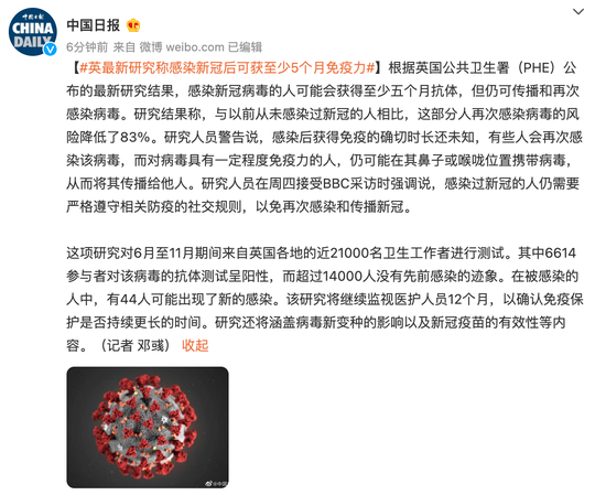 【#英最新研究称感染新冠后可获至少5个月免疫力#】根据英国公共卫生署(PHE)公布的最新研究结果,感染新冠病毒的人可能会获得至少五个月抗体,但仍可传播和再次感染病毒。研究结果称,与以前从未感染过新冠的人相比,这部分人再次感染病毒的风险降低了83%。研究人员警告说,感染后获得免疫的确切时长还未知,有些人会再次感染该病毒,而对病毒具有一定程度免疫力的人,仍可能在其鼻子或喉咙位置携带病毒,从而将其传播给他人。研究人员在周四接受BBC采访时强调说,感染过新冠的人仍需要严格遵守相关防疫的社交规则,以免再次感染和传播新冠。