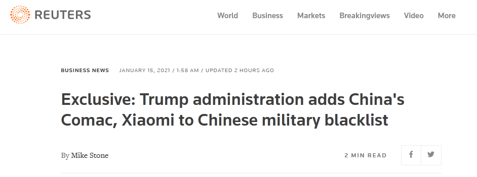 消息称,美国政府14日将9家中国企业列入所谓“与中国军方相关”的黑名单中,其中包括手机制造商小米及飞机制造商中国商飞。受消息影响,隔夜美股交易时间段,小米集团ADR盘中跌幅一度跌超14%,最后收跌7.54%。
