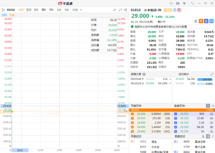 小米集团-W(01810-HK)下跌11.18%,现报29港元,跌3.65港元。