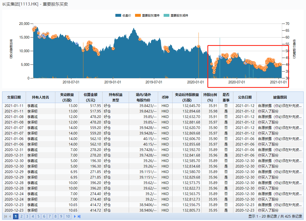 根据港交所数据统计,从2021年初至今仅仅半个月的时间,李嘉诚李泽钜父子旗下基金已经斥资超过2000万港元买入旗下公司长实集团。截至1月11日,李嘉诚旗下基金对长实集团的持股比例也上升至35.91%。