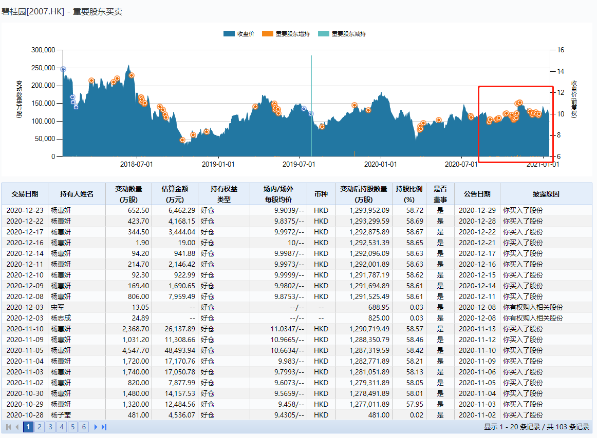 碧桂园执行董事兼联席主席杨惠妍自9月2日进行2020年首次增持之后,全年共32次增持碧桂园股份。截至2020年12月23日,杨惠妍在三个多月内累计增持碧桂园3.28亿股股份,涉及总金额约32.789亿港元,增持规模仅次于李嘉诚。
