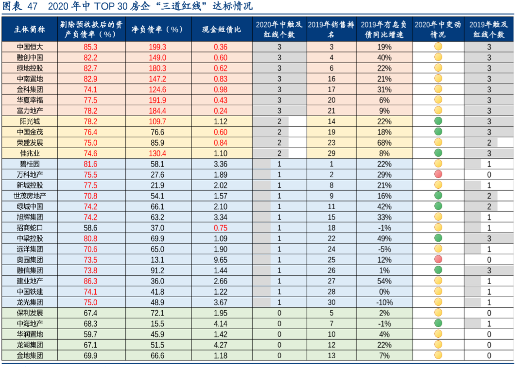 所谓“三道红线”指的是:房企剔除预收款后的资产负债率不得大于70%;房企的净负债率不得大于100%;房企的“现金短债比”小于1。依照这三个标准,全国上市TOP30房企中,仅有少数房企财务指示安全。