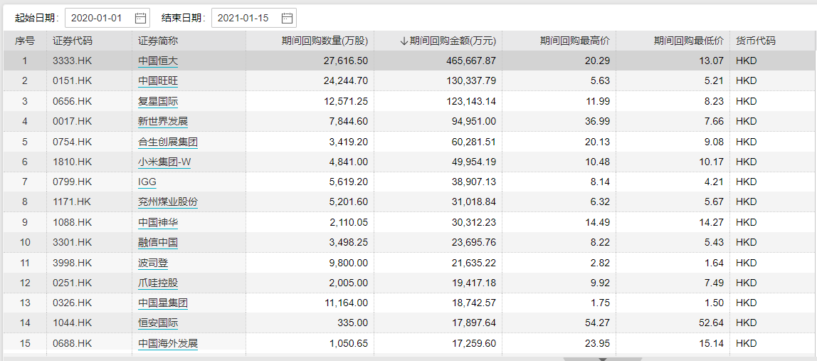 比如说,根据数据统计2020年初至今,按照公司回购总金额计算,港股TOP10分别是中国恒大、中国旺旺、复星国际、新世界发展、合生创展集团,小米,IGG,兖州煤业,中国神华,融信中国。